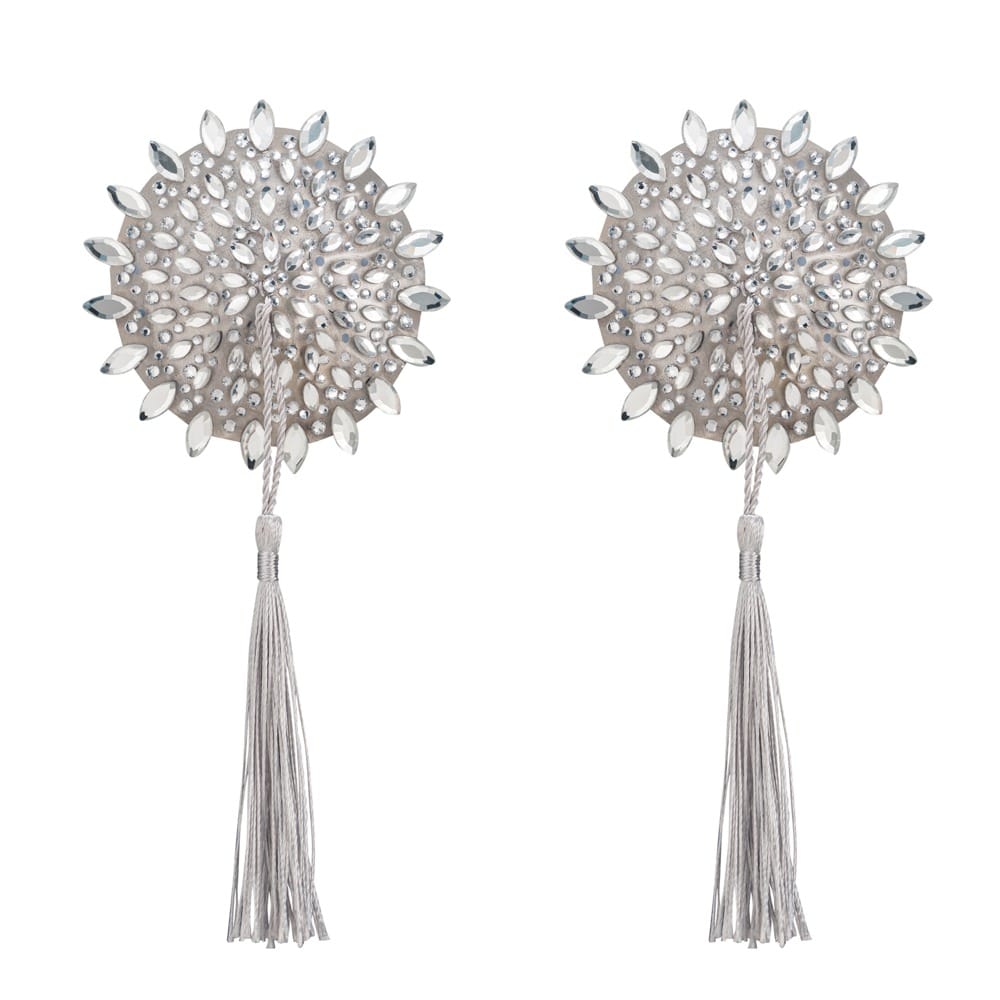 Die zekere glamourfactor!\nWitte, ronde Mistiqua tepelhulsjes van Obsessive met ontelbare glittersteentjes en speelse, delicate kwastjes. Zelfklevend en herbruikbaar. 1 paar. \n\nPolyester, polyurethaan.