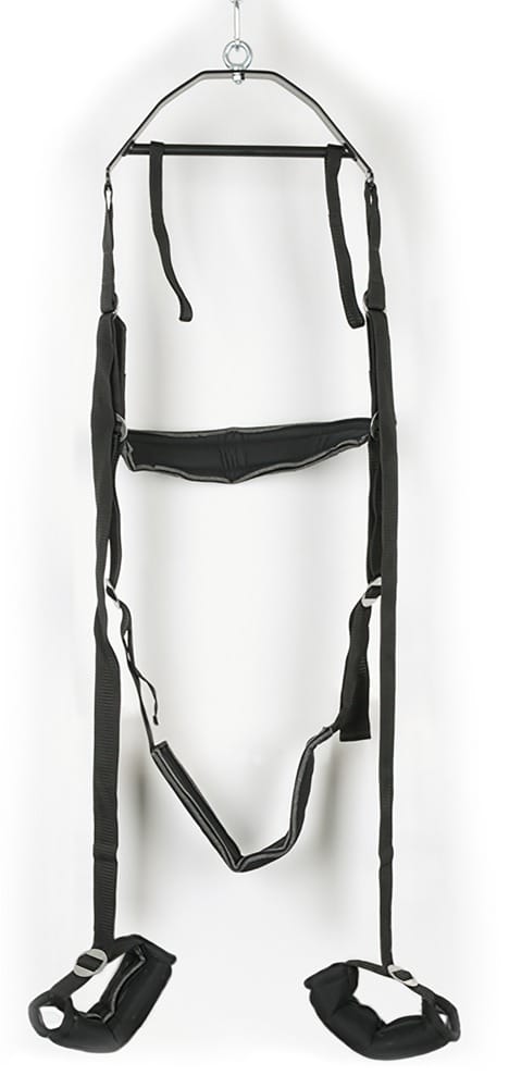 Posities die "technisch" onmogelijk zijn in bed worden een nieuw plezier met deze zwarte schommel. Draag- en montageconstructie (traverse) 38 cm breed. Riemen, hand- en voetlussen van scheurbestendig nylon, gewatteerd en in lengte verstelbaar. Belastbaar tot 100 kg. Inclusief zweep (38 cm lang) met 8 riemen en lederen handvat, oogmasker en montage accessoires.