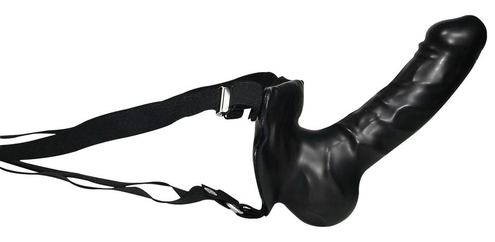 Switch! voorbind penis dildo van You2Toys gemaakt van zwart zacht latex, met gemodelleerde testikels en fijne adering. Verstelbare, elastische bandjes houden de pik stevig op zijn plaats.