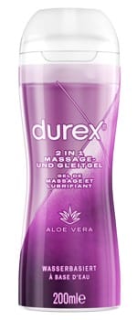 Voedende 2-in-1 gel op waterbasis van Durex met kalmerende aloë vera voor gebruik over het hele lichaam - niet plakkerig en niet vet! Hydrateert de huid en maakt haar zacht en soepel voor perfect massageplezier. Geschikt als glijmiddel voor vaginale, anale en orale seks. Aangename, licht zoete smaak. Geurvrij. Latex condoom veilig. 200 ml.