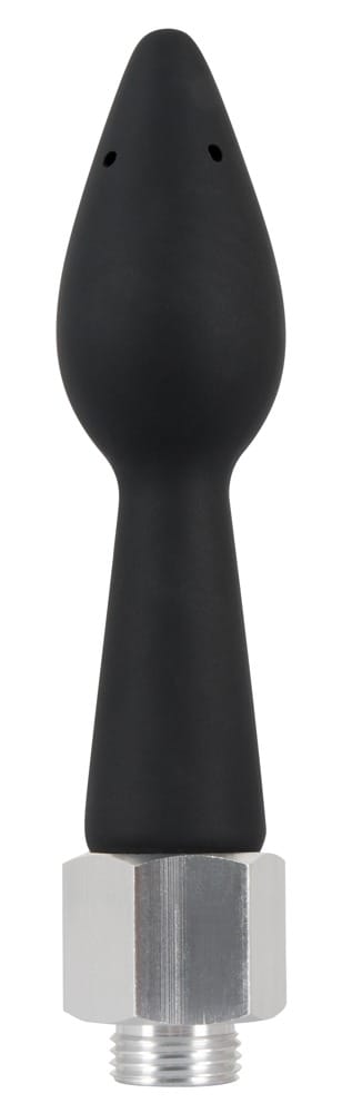 Schroef gewoon het schroefdraad van de intieme douche op een doucheslang en je bent klaar om te gaan: Het fluweelzachte oppervlak van de kegelvormige plug van zwarte silicone glijdt langzaam naar zijn bestemming voor intieme reiniging. Afhankelijk van de intensiteit van de douchestraal spuit er water uit vijf gaten, waarvan één in het uiteinde van de plug.