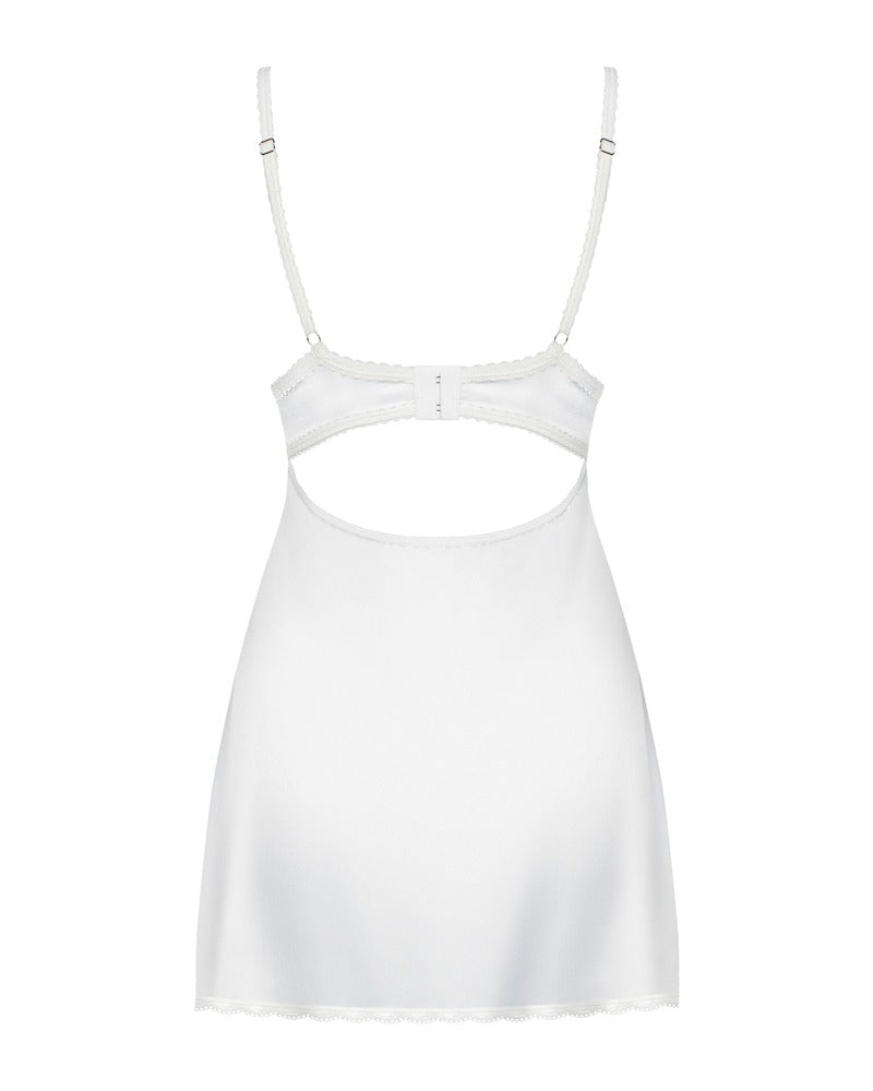 Aansluitend wit lingeriejurkje en bijpassende string in set 871-CHE-2 van Obsessive. Gemaakt van zijdeachtig satijn met kanten details. Een klein satijnen strikje en een decoratief element tussen de beugelcups zijn betoverend. De bandjes zijn verstelbaar, net als de haaksluiting op de rug.