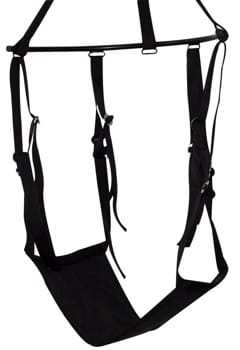 Zwarte Feels like Heaven liefdesschommel van You2Toys met een groot steunvlak en hand- en voetbanden van scheurbestendig materiaal. In hoogte verstelbaar van 90 cm tot 150 cm. Maakt verschillende seksstandjes mogelijk die anders niet mogelijk zouden zijn. Zonder bevestigingsmateriaal. Belastbaar tot 100 kg.